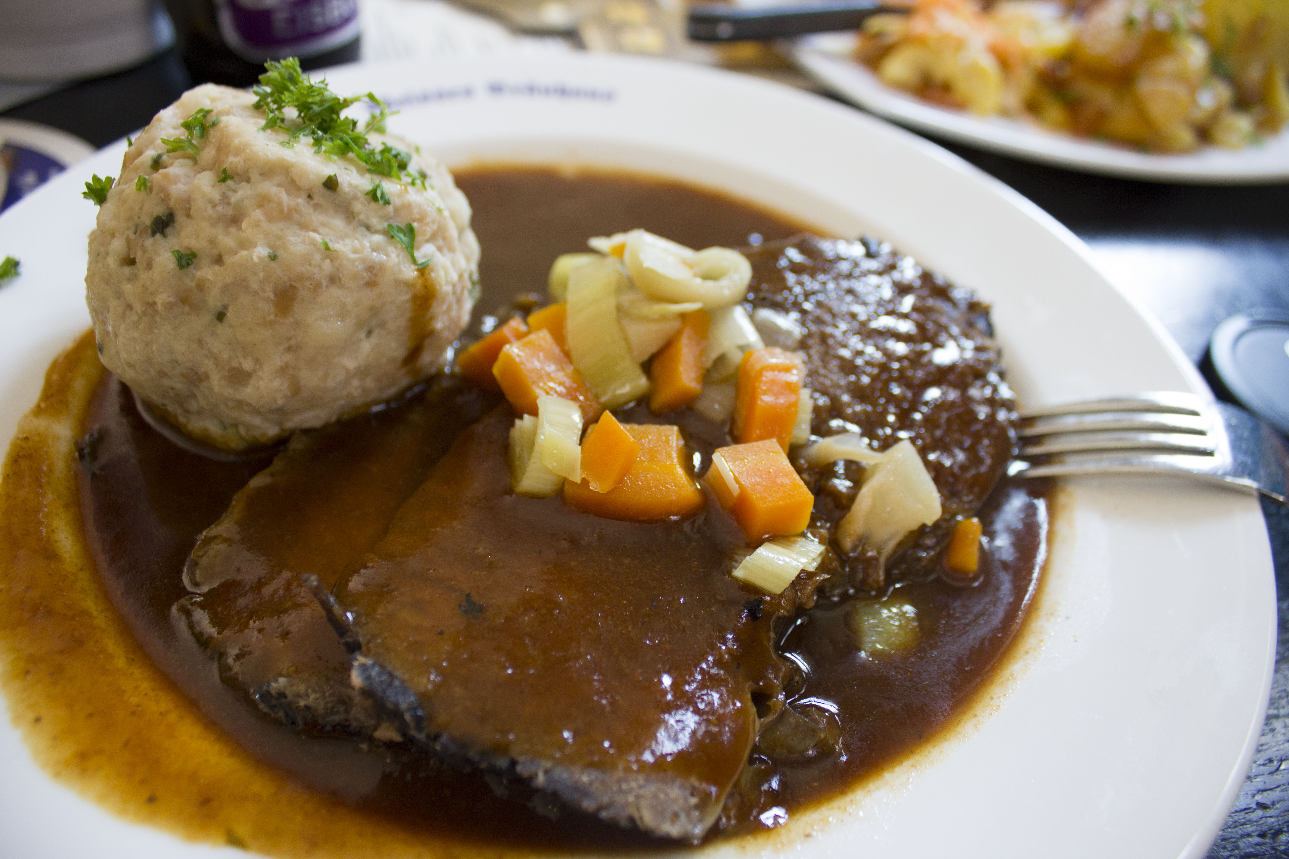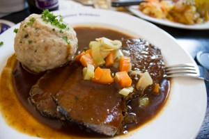 Oturduğunuzda masada Pretzel (Brezel)’ ler karşılıyor sizi. İkram sanmayın sonradan ne kadar yediyseniz parasını alıyor Alman’ lar 🙂 Good for Body and Soul – Bedeninize ve ruhunuza iyi gelir başlıklı menümüzde klasik Bavyara mutfağı yemeklerine Schneider’ in birbirinden leziz biraları eşlik ediyor. Biz yemek olarak Münih tipi Sauerbraten/Ekşi et rostosu söyledik. Etimiz Semmelknödel/Beyaz ekmek köftesi ile birlikte sunuldu.